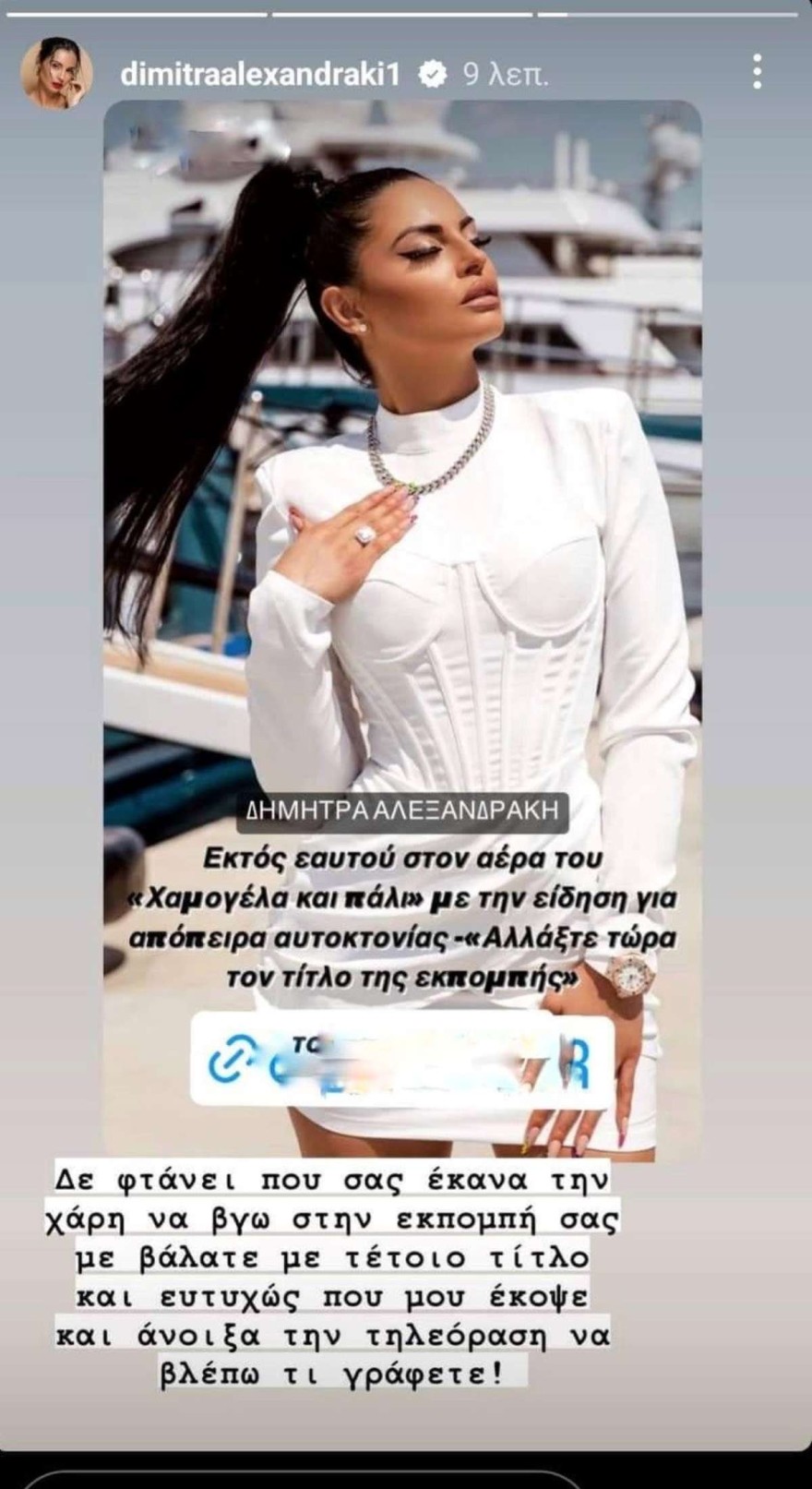 «Δε φτάνει που σας έκανα τη χάρη να βγω στην εκπομπή σας, με βάλατε με τέτοιο τίτλο και ευτυχώς μου έκοψε και άνοιξα την τηλεόραση να βλέπω τι γράφετε» έγραψε σε νέα ανάρτηση που έκανε αμέσως μετά.